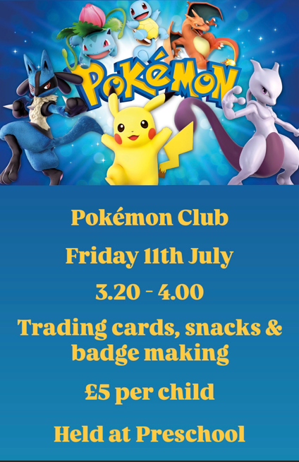 Preschool is holding a Pokémon event after school on Friday 11th July.